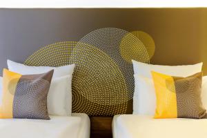 A modern spacious room with 2 single beds, bathroom with rain shower, sofa bed, work area, 40” TV with media hub and free WIFI, hair dryer, safe box, mini bar and coffee/tea making facilities, coffee machine, bathrobe and slippers.