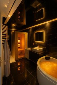 The hot tub and sauna are the standout features of this apartment. Boasting a private entrance, this air-conditioned apartment comes with a kitchen, 1 bedroom and 1 bathroom with a walk-in shower and a bath. Meals can be prepared in the well-fitted kitchen, which features a stovetop, a refrigerator and kitchenware. The apartment has parquet floors, a seating area with a flat-screen TV with streaming services, soundproof walls, a tea and coffee maker, as well as a dining area. V této ubytovací jednotce se nachází 1 postel.