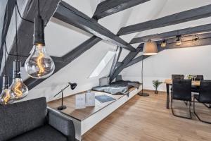 Das Apartment NUVANA FLATS - Loft 522 Dachterrasse mit Altstadtflair mit Balkon und Stadtblick bietet 1 Schlafzimmer, ein Wohnzimmer, einen Flachbild-TV, eine Küche mit Kühlschrank und Geschirrspüler sowie 1 Bad mit Dusche. In dieser Ferienwohnung werden Handtücher und Bettwäsche angeboten.