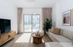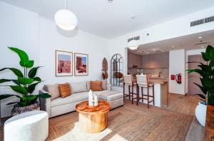 El apartamento One Bedroom Apartment by Otolo Homes with Free Yas Theme Park Tickets cuenta con aire acondicionado, 1 dormitorio, sala de estar, cocina completa con nevera y cafetera, y 1 baño con ducha y artículos de aseo gratuitos. Hay TV de pantalla plana.