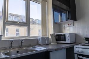 Apartmán v One Bedroom Flat by Brookland Stays Serviced Accommodation Short Lets Blackpool with Free WiFi má 1 ložnici, obývací prostor, plně vybavenou kuchyň a 1 koupelnu. Apartmán má také koupelnu.