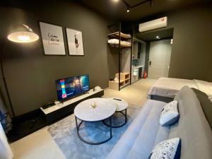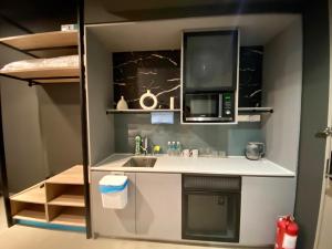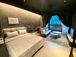 Zur Einrichtung des One Utama Mossaz Studio gehören ein Schlafzimmer, ein Flachbild-TV und eine Küche.