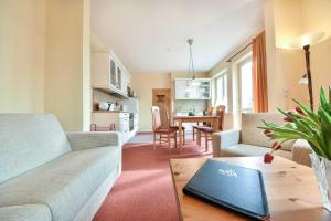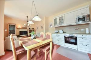 Apartament mieści sypialnię, salon, łazienkę z prysznicem oraz kuchnię z lodówką i ekspresem. Ręczniki i pościel są dostępne w apartamencie Ostseepark Captain`s Haus 1 3.
