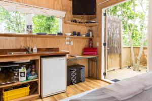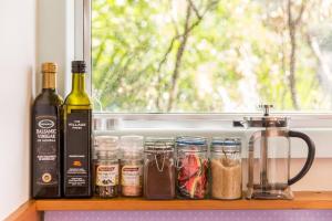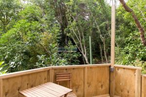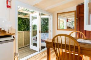 This bungalow is an original 1947 beach bach. Compact but bright, it features a covered verandah under the tree canopy with views across the valley.