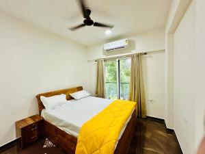 Апартаменты с кондиционером в Palm View 1BHK with Pool & Café - Sazo Stays выходят на террасу с видом на сад и имеют 1 спальню и полностью оборудованную кухню. В номерах Palm View 1BHK with Pool & Café - Sazo Stays установлен телевизор с плоским экраном.