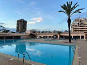 Das Apartment Paraiso Sol da Rocha BL B bietet eine Terrasse, 1 Schlafzimmer, ein Wohnzimmer sowie eine Küche mit Kühlschrank und Backofen.