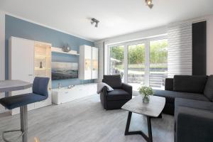 Apartament Passatstieg 1 Lüddn Traum mieści sypialnię, salon, łazienkę z prysznicem i suszarką oraz kuchnię z lodówką i ekspresem. Goście mają do dyspozycji telewizor.