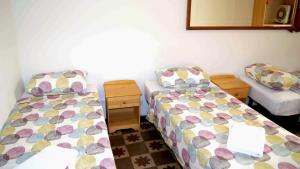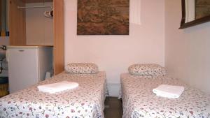 Twin Room with back balconies and shared Bathroom. This simple room has a sink, a fan and a fridge. There is access to a shared bathroom.