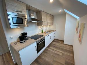 Apartament Pension Pradler Wohnung Obergeschoß mieści sypialnię, salon, łazienkę z prysznicem i suszarką oraz kuchnię z lodówką i ekspresem. W Pension Pradler Wohnung Obergeschoß Goście mają do dyspozycji telewizor z płaskim ekranem i kanałami satelitarnymi.