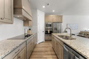 W domu wakacyjnym z 4 sypialniami zapewniono salon z telewizorem, kuchnię z pełnym wyposażeniem, w tym lodówką i zmywarką, a także kilka łazienek (5) z wanną z hydromasażem.