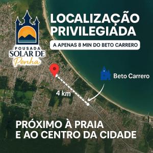 Ubicato a Penha, a 400 metri da Praia Do Quilombo, Pousada Solar de Penha offre una vista sulla città. La struttura si trova a circa 700 metri da Anjo Dourado, 6,2 km da Univali Oceanographic Museum e 7,3 km da Beto Carrero World. L'alloggio propone il servizo in camera e il WiFi gratuito in tutta la struttura.