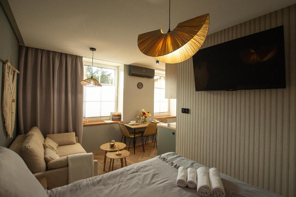 Das klimatisierte Przystanek Rudawy umfasst ein Schlafzimmer, ein Wohnzimmer, eine voll ausgestattete Küchenzeile mit Kühlschrank und Kaffeemaschine sowie ein Bad mit Dusche und Haartrockner. In dieser Ferienwohnung werden Handtücher und Bettwäsche angeboten.