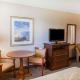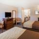 All spacious guest rooms come equipped with refrigerators, coffee makers, irons, ironing boards, hair dryers and satellite television with free HBO. Some rooms have microwaves. Two-room suites feature kitchenettes and living room areas. The hotel is 100% smoke free.