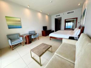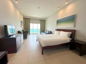The spacious quadruple room features air conditioning, soundproof walls, a balcony with sea views as well as a private bathroom boasting a bath.
