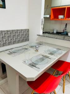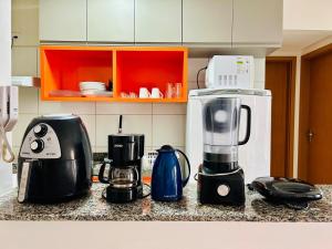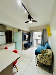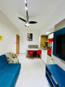 El apartamento Recanto Azul Ubatuba consta de 2 dormitorios, sala de estar, cocina equipada con nevera y cafetera, y 1 baño con ducha y secador de pelo. Hay TV de pantalla plana.