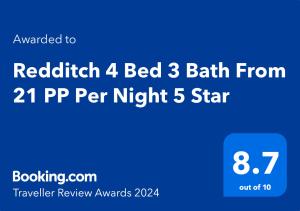 Obiekt Redditch 4 Bed 3 Bath From 21 PP Per Night 5 Star oferuje ogród, patio oraz widok na ogród. Odległość od ważnych miejsc: Rezydencja Coughton Court - około 8,7 km. Odległość od ważnych miejsc w pobliżu domu wakacyjnego Redditch 4 Bed 3 Bath From 21 PP Per Night 5 Star wynosi: Park Lickey Hills - 17 km, Muzeum Cadbury World - 18 km.
