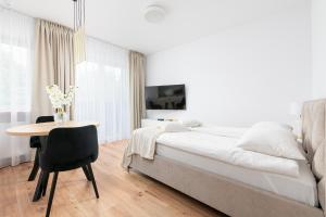 The apartment has 1 bedroom, a flat-screen TV with streaming services, a fully equipped kitchenette with a dishwasher and an oven, a washing machine, and 1 bathroom with a shower. Towels and bed linen are offered at the property. RentPlanet - Studio Helenów Park includes an outdoor dining area.
