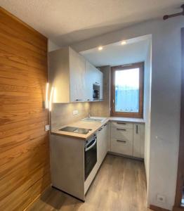The 1-bedroom apartment at Résidence Le De 1 - Joli deux pièces à proximité des pistes MAE-4874 comprises a living room with a TV, a bathroom with a hair dryer, and a fully equipped kitchen with a dishwasher and oven.