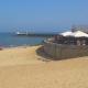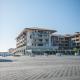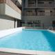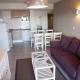 This apartment features a balcony, a living area with a satellite TV and a bathroom with a bathtub. The kitchenette includes a microwave, stove and dishwasher.