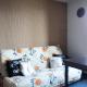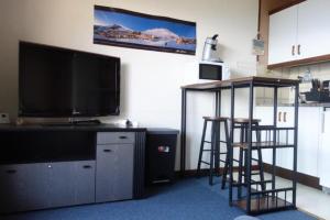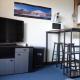Opening onto a balcony, the apartment consists of a fully equipped kitchen and a TV.