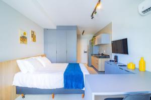 Апартаменты Rooftop #605 - Suíte em Boa Viagem por Carpediem с кондиционером включают спальню, ванную комнату и кухню, оснащенную холодильником и микроволновой печью. Полотенца и постельное белье включены в стоимость проживания в Rooftop #605 - Suíte em Boa Viagem por Carpediem.