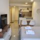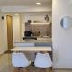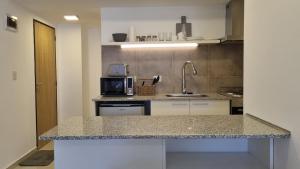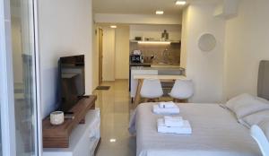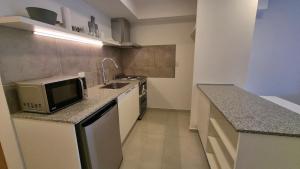 Apartament w Ruka Studio en Bariloche Centro posiada sypialnię (1) oraz kuchnię z lodówką, mikrofalówką i ekspresem do kawy. Ręczniki i pościel są dostępne w apartamencie.