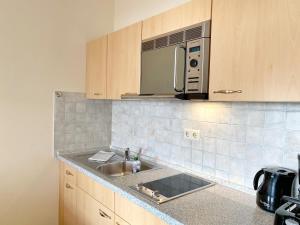 La distribución de Sassnitz - Villa Anna Villa Anna App 13 incluye 1 dormitorio, sala de estar, cocina completa con nevera y cafetera, y baño con ducha. El apartamento Sassnitz - Villa Anna Villa Anna App 13 dispone de toallas y ropa de cama.