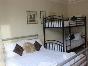 This en suite family room has a double bed and a set of single bunk beds. The en suite includes a shower, hand basin, toilet and heated towel rail. An ironing board is situated in the wardrobe and an iron can be requested from reception.