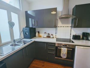 The well-equipped kitchen has a stovetop, a refrigerator, kitchenware and an oven. The apartment features carpeted floors, a seating area with a flat-screen TV, a private entrance, a dining area as well as a quiet street view. The unit has 1 bed.