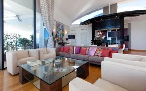 This suite has a balcony, dining area and seating area. 2-storey apartment. On the ground floor there is a large terrace with outdoor furniture, and on the roof there is a private hot tub and hammocks. The living area has a sofa bed and dining table, it is connected between the two floors with an internal staircase.