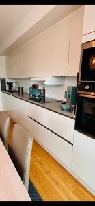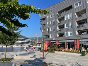 L\'appartement Sentrumsnær leilighet Bergen comprend 2 chambres, une salle de bains, du linge de lit, des serviettes, une télévision à écran plat, un coin repas, une cuisine équipée et un balcon avec vue sur la ville.