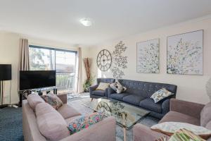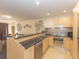 This air-conditioned apartment features a fully equipped kitchen with stainless steel appliances including a dishwasher, oven and a stove top. It also includes a large living area with a TV. The bathroom has both a bath and a shower.