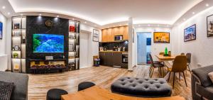 This apartment features a fireplace. Boasting a private entrance, this air-conditioned apartment features 1 living room, 2 separate bedrooms and 2 bathrooms with a shower and a hairdryer. Guests will find a stovetop, a refrigerator, a dishwasher and kitchenware in the kitchen. The apartment also comes with a barbecue. The spacious apartment features a washing machine, soundproof walls, a tea and coffee maker, a flat-screen TV with streaming services, as well as garden views. V této ubytovací jednotce se nachází 6 postelí.
