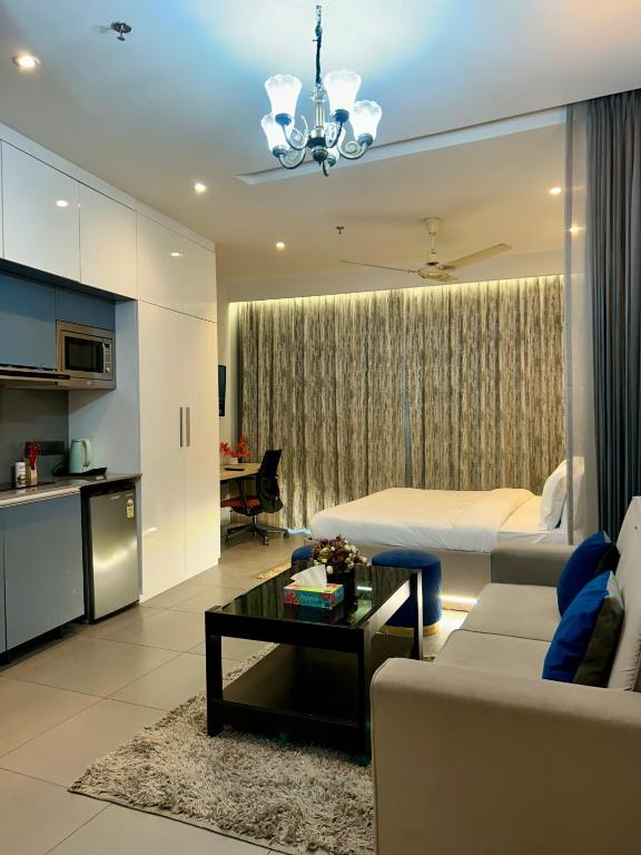 SkyHigh Stays se nachází v destinaci Noida a nabízí zahradu, bezplatné Wi-Fi, sdílený lounge a pokojovou službu. Tento apartmán s klimatizací poskytuje patio.
