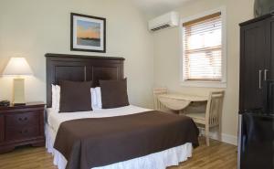 This room features a microwave, small refrigerator, and 32-inch flat-screen cable television. A patio is also included. Decor may vary.