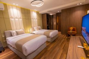 Guest rooms are equipped with a flat-screen TV with satellite channels, minibar, a kettle, a shower, free toiletries and a wardrobe. Each room is equipped with a safety deposit box and some rooms are equipped with city views.