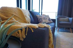 Questo appartamento con aria condizionata comprende 2 camere da letto, un soggiorno, una cucina con utensili, frigorifero e bollitore elettrico, e 2 bagni con doccia e vasca idromassaggio. Asciugamani e lenzuola sono inclusi nei servizi di 5 Star Beachfront Sky Home in Prime Location.