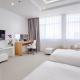 The guest rooms are elegantly designed in a clean white palette with soft gray accents, creating a refined and relaxing atmosphere. Each room is fully equipped with air conditioning, a flat-screen satellite TV, and a private bathroom featuring a shower, smart toilet, hairdryer, and complimentary toiletries.