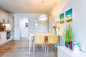 El apartamento en StrandGut -Moderne Ferienwohnung mit Balkon und Sauna - strandnah! tiene 2 dormitorios, baño con ducha y secador, lavadora y cocina con nevera y lavavajillas. Se ofrece TV.