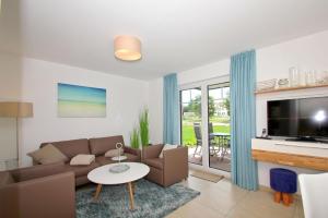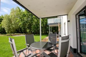 At strandnahe FeWo mit Terrasse, gratis Nutzung vom AHOI Erlebnisbad und Sauna in Sellin - Rex Rugia FeWo 11-2, the spacious apartment features 2 bedrooms, a TV, a bathroom with a shower, and a fully equipped kitchen with an oven and dishwasher. strandnahe FeWo mit Terrasse, gratis Nutzung vom AHOI Erlebnisbad und Sauna in Sellin - Rex Rugia FeWo 11-2 includes an outdoor dining area.
