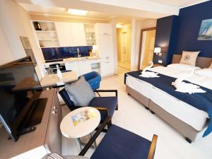 Apartmán Strandresort Prora - WG 216 mit Meerblick und IR-Sauna zahrnuje 1 ložnici, plně vybavený kuchyňský kout s lednicí a myčkou a 1 koupelnu se sprchou. V apartmánu ubytování najdete TV s plochou obrazovkou a koupelnu s fénem.