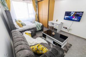 Apartmán Studio in Kileleshwa má 1 ložnici, TV s plochou obrazovkou a kuchyňský kout.