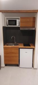 Questo appartamento prevede 1 camera da letto, un soggiorno e un angolo cottura con utensili, frigorifero e microonde.