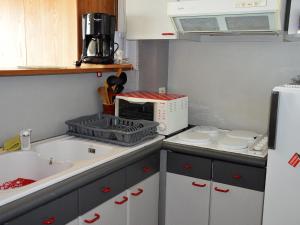 В этих апартаментах есть телевизор. Кухня в Studio Confortable pour 3 près Plage, Parking, Cuisine équipée - FR-1-323-459 оснащена холодильником, микроволновой печью, плитой, кофемашиной и чайником.