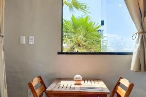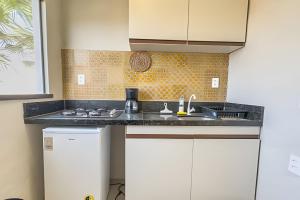This air-conditioned unit at Studio Crochê - Vista Mar- Piscina- Hidro- Ar comprises 1 bedroom, 1 bathroom, and a fully equipped kitchen with a stovetop and fridge.