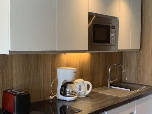 Oferta apartamentu obejmuje taras oraz salon z telewizorem. Wyposażenie kuchni obejmuje mikrofalówkę, płytę kuchenną, toster, a także ekspres do kawy i czajnik.