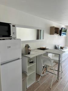 Questo appartamento con aria condizionata dispone di pranzo, cucina con frigorifero e TV a schermo piatto.