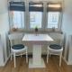 Das Stuv Mariken - Apartment in Warnemünde bietet 1 Schlafzimmer, 1 Bad, Bettwäsche, Handtücher, Flachbild-TV, Essbereich, Küche und Balkon mit Stadtblick.