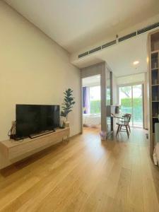 Tento klimatizovaný apartmán Stylish 1BR Condo by BTS Ekkamai - Infinity Pool & Gym má 1 ložnici, posezení, TV s plochou obrazovkou a kuchyň s lednicí.