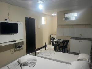 Tento prázdninový dům má TV s plochou obrazovkou a 1 ložnici. Prázdninový dům Suíte com ar a 500m da praia má pro hosty připraveny ručníky a ložní prádlo.